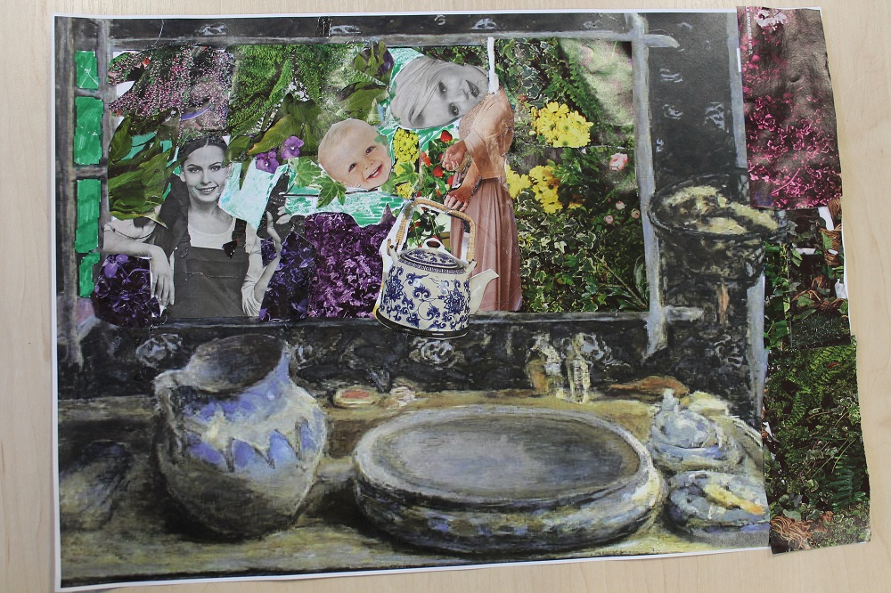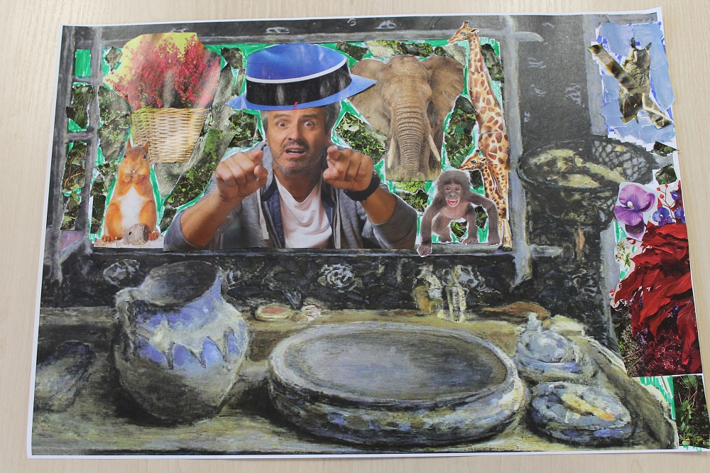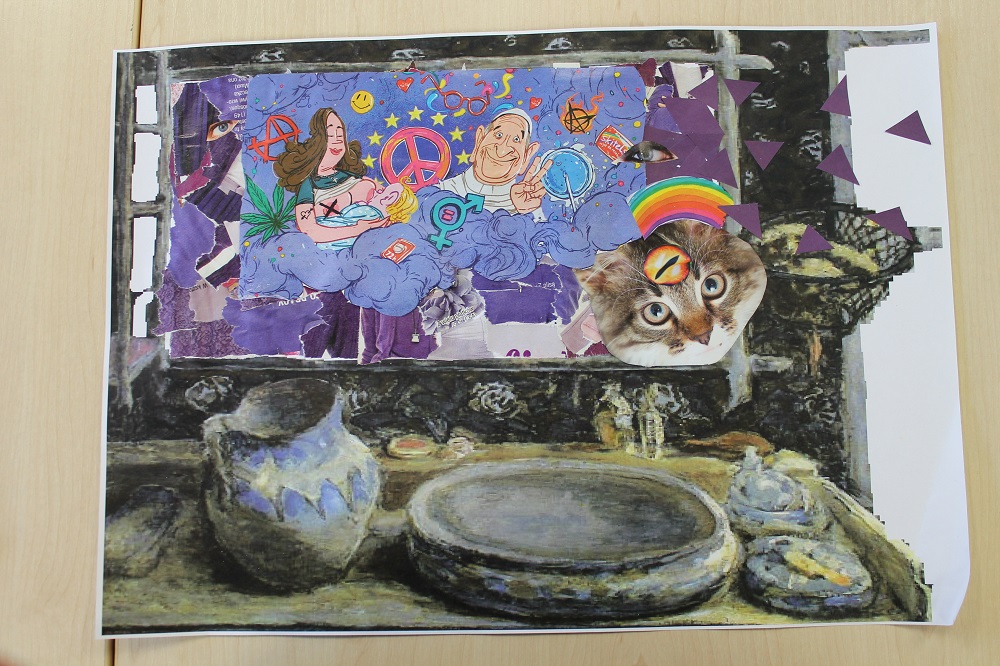 dr hab. sztuki Tomasz Nowak / „Co kryje odbicie w zwierciadle” collage Mając do dyspozycji reprodukcję kompozycji malarskiej z dominującą formą zwierciadła w pokoju/łazience spróbujmy wykreować obraz odbijający się w zwierciadle.